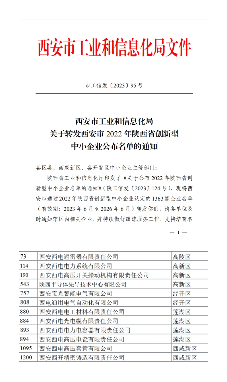 日前,陜西省工信廳印發(fā)《關(guān)于公布2022年陜西省創(chuàng)新型中小企業(yè)名單的通知》,文件公布了《西安市2022年陜西省創(chuàng)新型中小企業(yè)名單》,公司所屬西電電力系統(tǒng)、西電套管、西電西容、西電西材、西電光電纜、西電避雷器、西電西瓷、西電操動(dòng)機(jī)構(gòu)、西電通用、西開鑄造、寶光智能、先導(dǎo)中心成功入選,被認(rèn)定為2022年陜西省創(chuàng)新型中小企業(yè)。