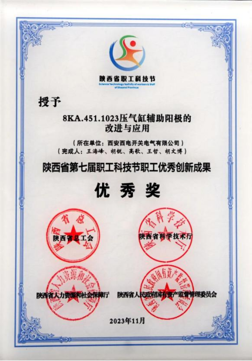 陜西省職工優(yōu)秀創(chuàng)新成果優(yōu)秀獎——西開電氣“8KA.451.1023壓氣缸輔助陽極的改進與應(yīng)用”