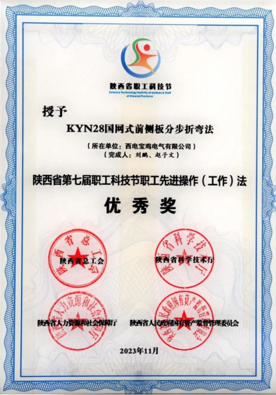陜西省職工先進操作(工作)法優(yōu)秀獎——西電寶雞電氣“KYN28國網(wǎng)式前側(cè)板分步折彎法”