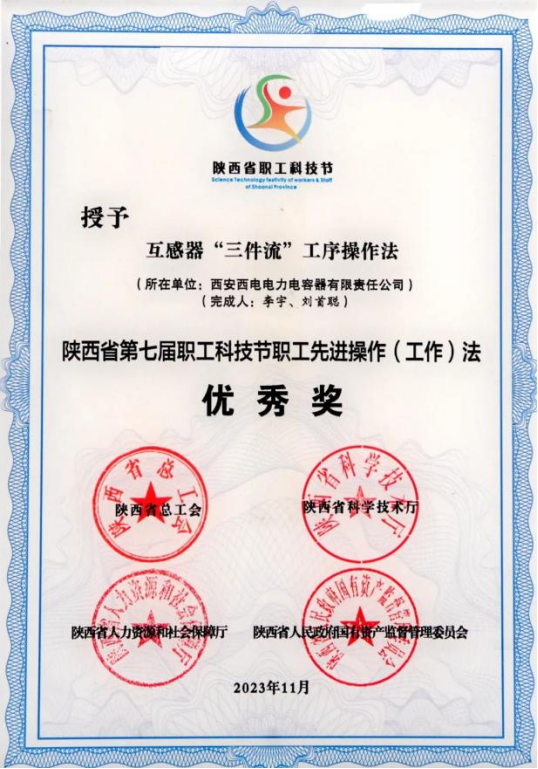 陜西省職工先進操作(工作)法優(yōu)秀獎——西電西容“互感器'三件流'工序操作法”