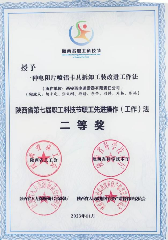 陜西省職工先進操作(工作)法優(yōu)秀獎——西電避雷器“一種提高電阻片造粒料回收率和質(zhì)量的先進操作方法”