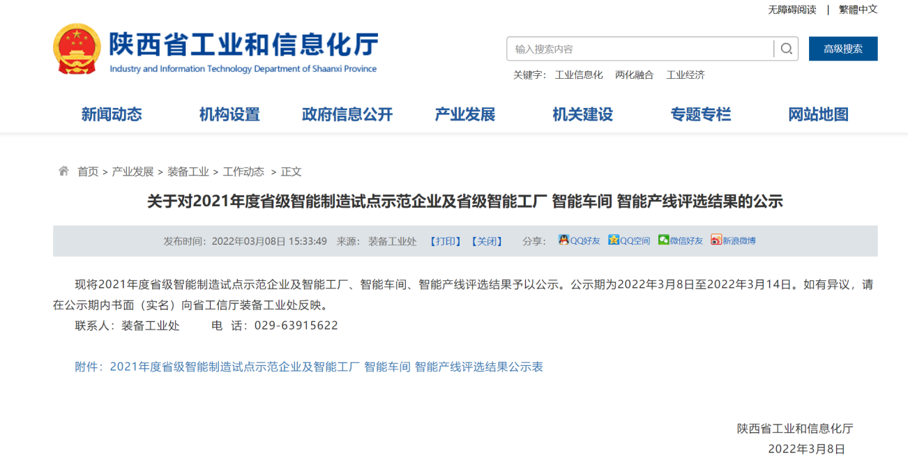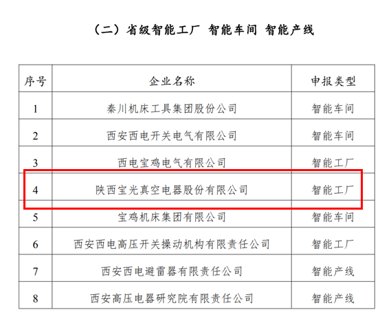 3月14日,陜西省工信廳裝備工業(yè)處發(fā)布2021年度省級(jí)智能制造試點(diǎn)示范企業(yè)及省級(jí)智能工廠名單,寶光股份獲評(píng)“2021年度省級(jí)智能工廠”。